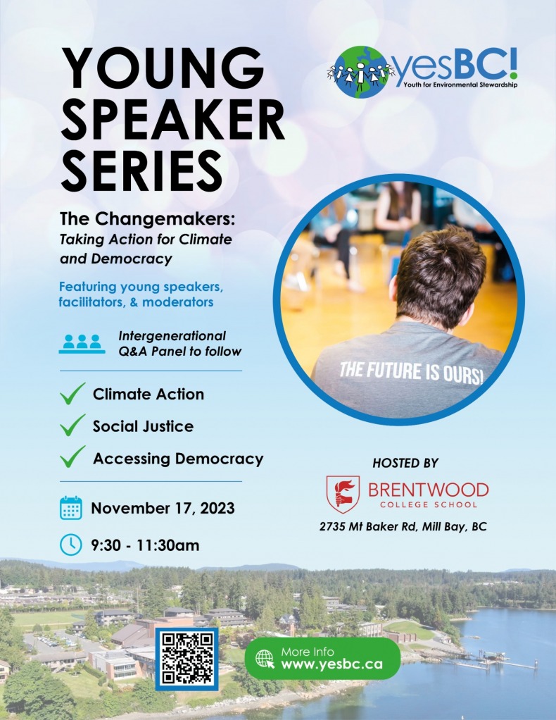 Our YesBC Young Speaker Series launched November 17, 2023 at Brentwood College School in Mill Bay, BC. 140 Students and teachers from 6 schools on Southern Vancouver Island gathered for a session that was planned, hosted and executed by students from Brentwood College with mentoring from YesBC. Presentations by students were followed by an intergenerational panel, that included Member of Parliament for Malahat-Cowichan-Langford, Alistair MacGregor.